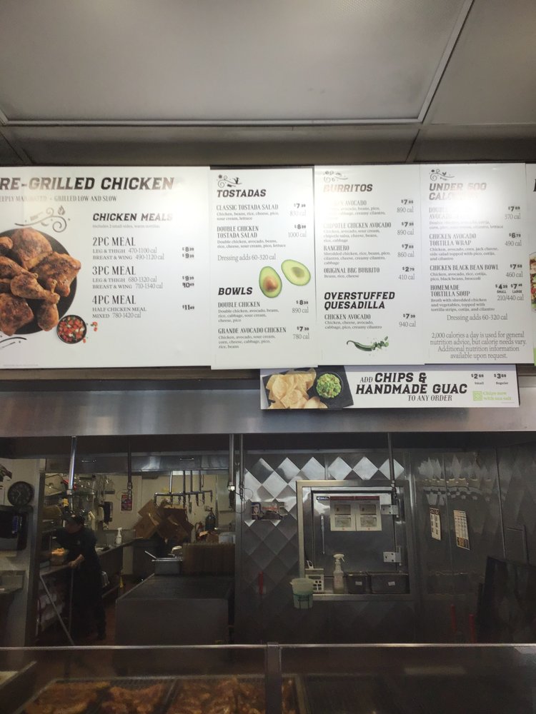 Citrus-marinated, fire-grilled chopped chicken, handmade guacamole, creamy chipotle sauce, shredded Jack cheese, savory pinto beans, seasoned rice and crisp shredded cabbage wrapped in a warm flour tortilla and grilled to-go. Combo includes chips, salsa, and regular drink.